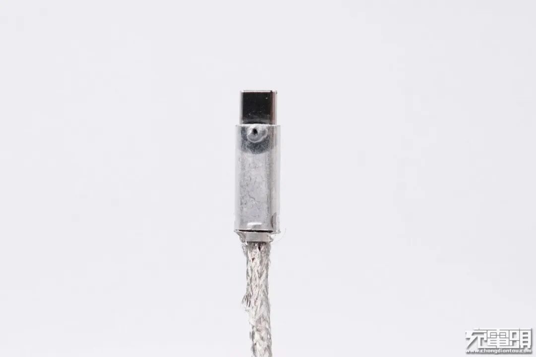 切割掉塑料外壳,里面使用金属钢套进行全封闭式包裹保护,封装严实,在钢套和公头交界处可以看到一个很明显的点焊。