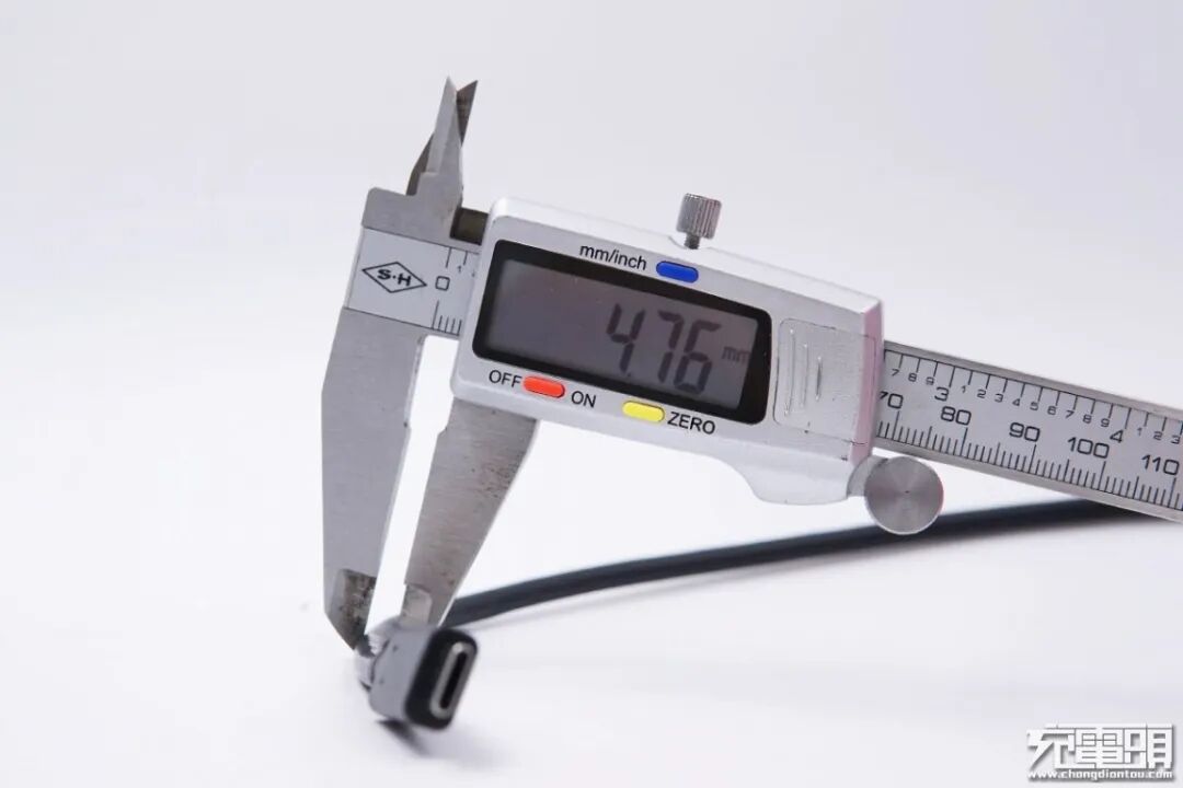 使用游标卡尺实测数据线直径4.76mm,可见这根数据线非常粗壮,结实耐用。