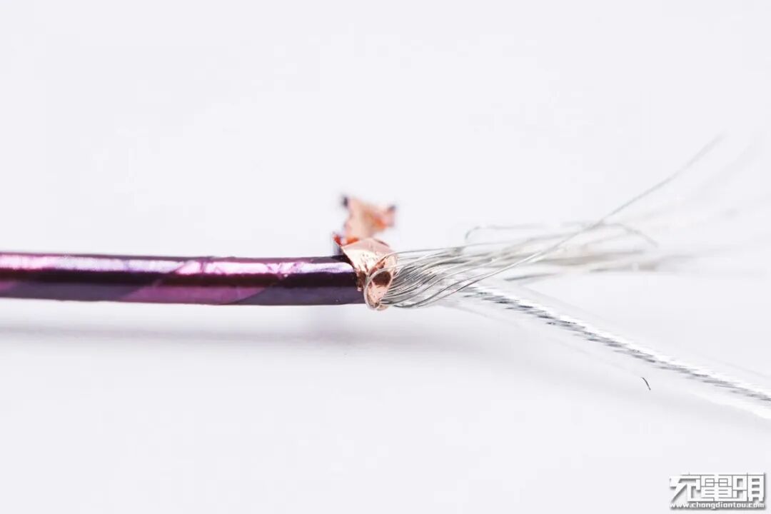撕开紫色线芯外面的塑料外皮,里面是一层屏蔽铜箔,铜箔下面是由镀锡铜线芯组成的金属屏蔽网,同轴屏蔽线。