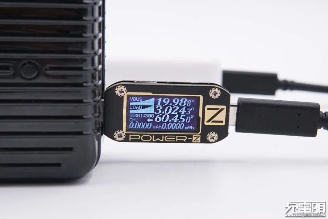 实际充电测试,使用这根数据线搭配充电器给定制100W移动电源进行充电,显示充电电压19.98V,电流3.0A,充电功率达到60.5W,测试显示该线缆支持60W充电,并且经过长时间充电测试,线缆正常工作,没有出现异常情况。