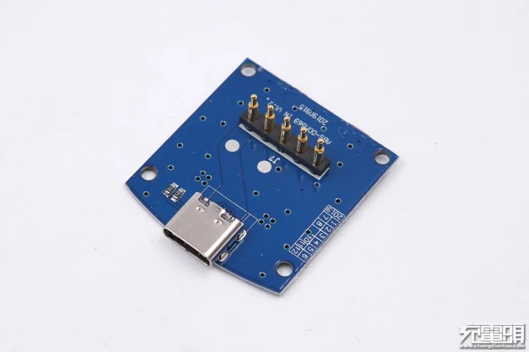 充电顶针针脚处套有黑色塑料块加固,USB-C母座过孔焊接。