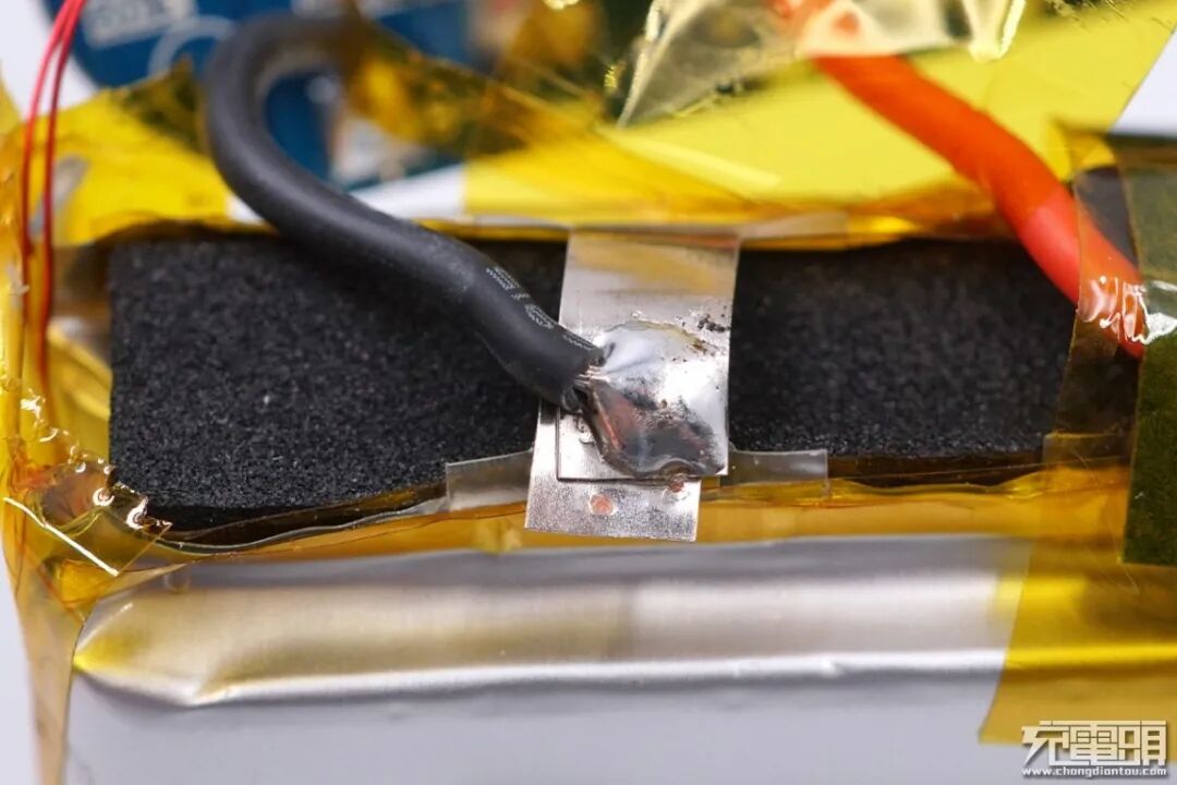 两块电芯使用焊片点焊并联,黑色导线焊点饱满,电芯极耳处有海绵填充。