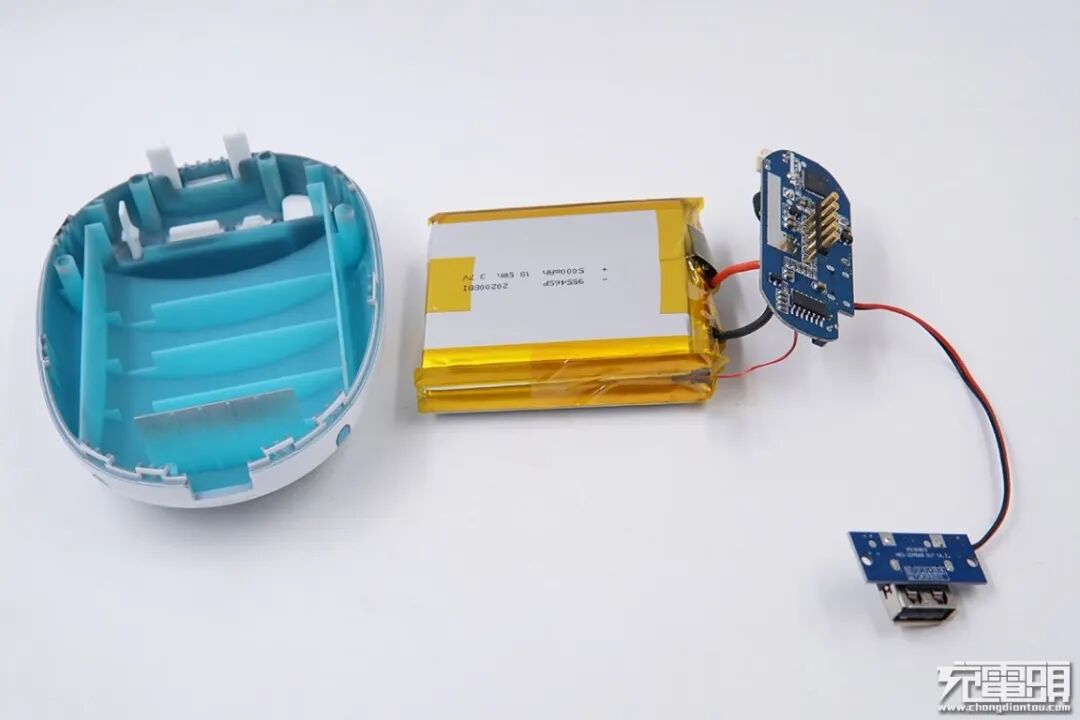 拆掉螺丝取出PCB板和电芯,两块电芯使用胶带捆绑在一起,外壳内部是电池隔舱。