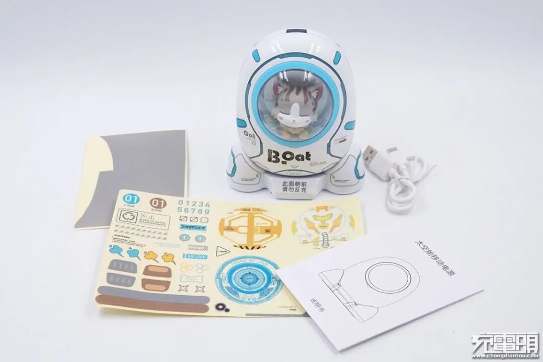 包装内含太空舱移动电源、充电数据线、使用说明书和DIY贴纸。