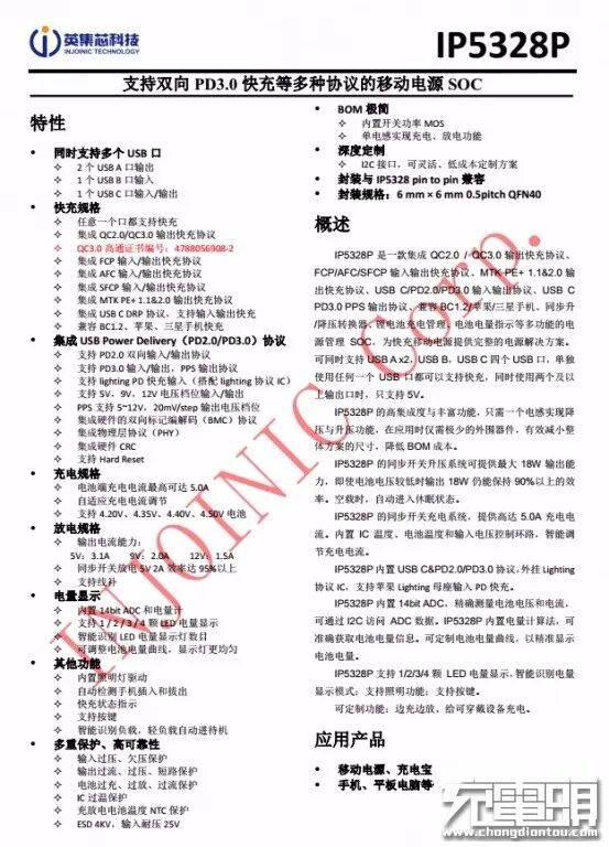 英集芯IP5328规格资料。充电头网了解到,采用英集芯IP5328P的产品还有黑鲨双向快充移动电源、倍思无线快充PD移动电源、京造10000mAh双向USB PD快充移动电源、格力18W PD双向快充移动电源、腾讯赤兔马移动电源等产品。同时,英集芯的快充芯片还可用于充电器、车充等领域,并获得市场高度认可。
