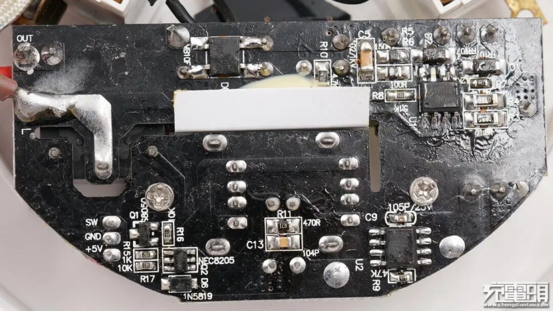 PCB板背面为AC-DC降压电路,设有两颗控制芯片以及一颗整流桥。在高压电路和低压电路之间采用镂空处理,并加装绝缘板隔离。