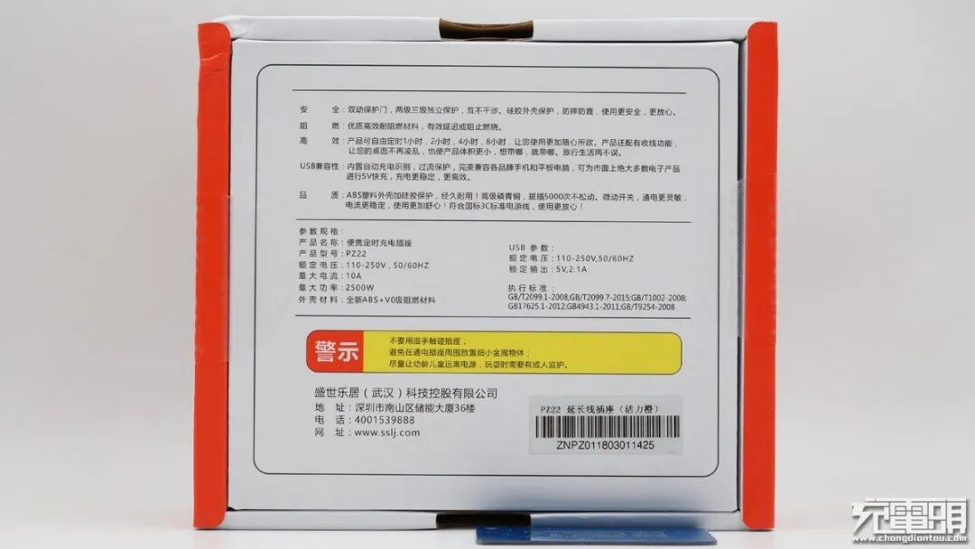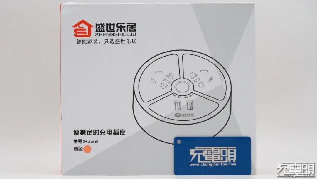 盛世乐居这款插线板名为:便携定时充电插座,型号PZ22。产品采用白色包装盒,正面印着产品的外观简图和颜色。
