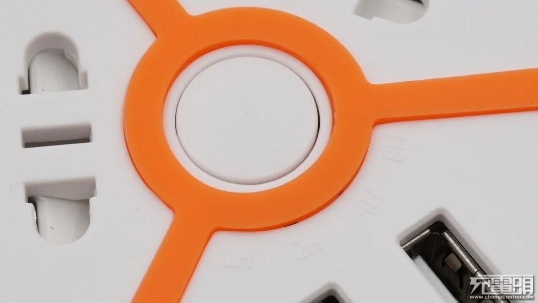 这款充电插座采用圆盘设计,橙色机身搭配白色面板,正面面板分为三等分,设有两个国标五孔插孔和两个USB-A输出接口。居中为一个按键,负责开启、关闭以及定时功能的设置。