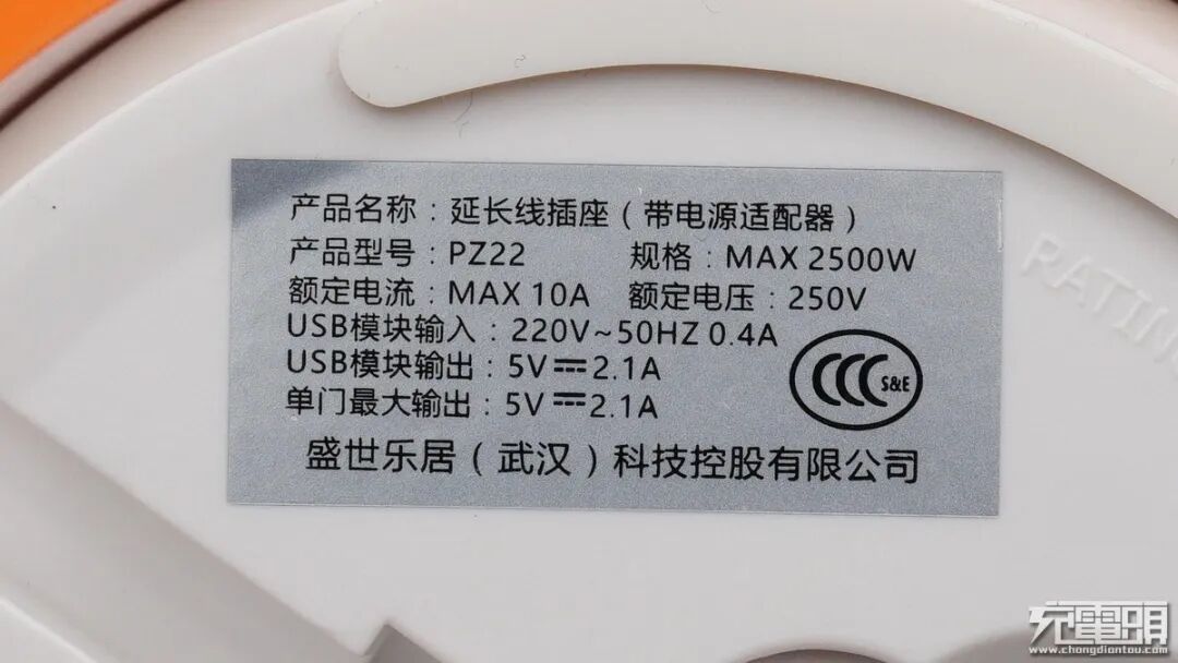 插座底部的贴纸可以看出,这款插座的型号为PZ22,额定电压250V,额定电流10A,最大功率:2500W。USB部分支持220V~ 50hz 0.4A输入,单口支持最大5V/2.1A输出,已经通过了CCC认证。