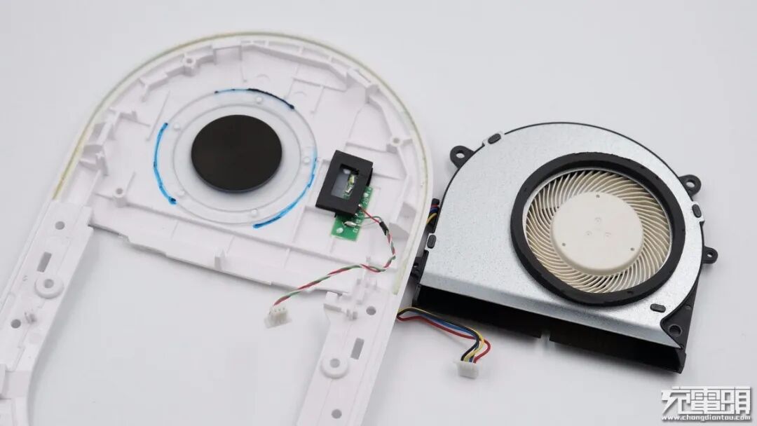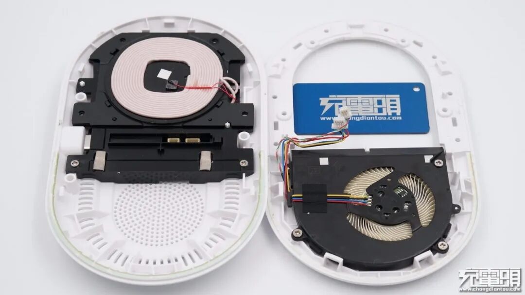 降热方面,OPPO采用了自研蝶翼风冷技术,而且风扇扇叶设计得很薄很密,其中一面还被透明塑料观察窗封闭起来,底部进气,细节到位,整体搭配下来大大增强了产品散热性能。产品由立讯精密代工,无线充电线圈绕制紧密,导线焊接牢固,整体做工扎实。