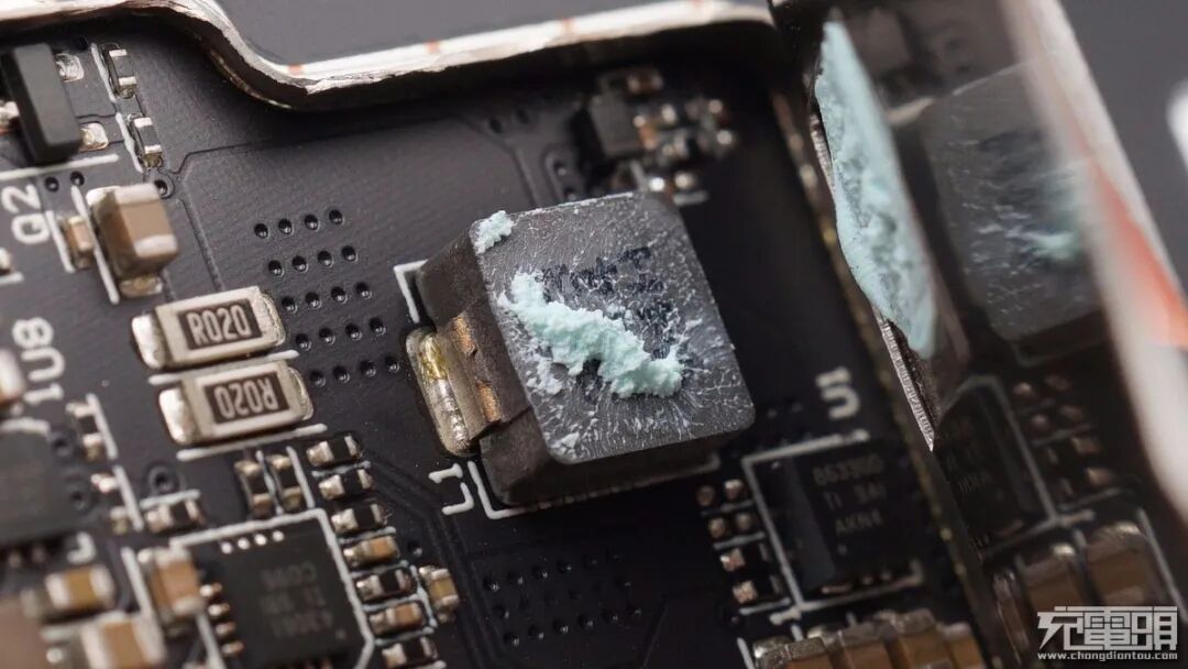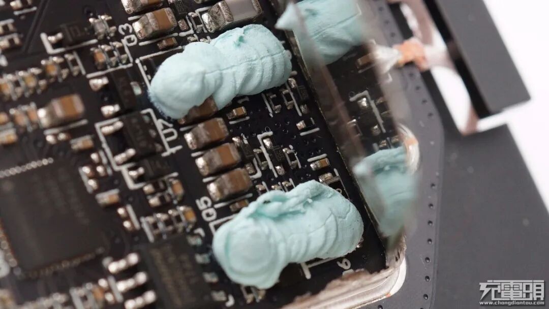 无线充电功率管上涂有淡蓝色硅胶接触屏蔽罩帮助导热。