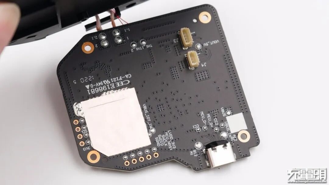 PCB板背面一览,没有焊接有芯片,左下角贴有一块铜箔帮助无线充电主控芯片散热,Type-C母座打胶加固。