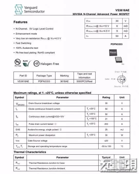 威兆VS3618AE资料信息。充电头网了解到,采用威兆VS3618AE的产品还有华为40W超级快充立式无线充电器、华为27W超级快充无线车充、小米无线车充、小米无线充电宝、坚果饼式无线充电座、魅族无线充电器。同时该MOS还可用于PD快充领域,曾被紫米10000mAh移动电源、小米65W USB PD快充充电器、onn 18W USB PD快充充电器等数十款产品采用。