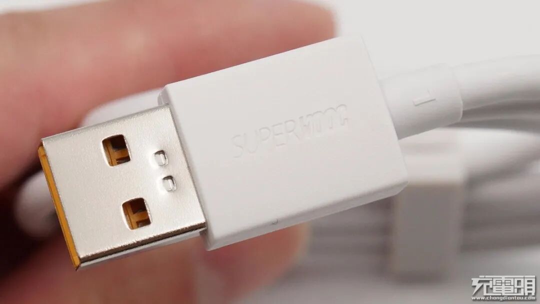 USB-A线头塑料壳磨砂处理增大摩擦力,使插拔更加方便,此外还凹印SUPERVOOC字样。