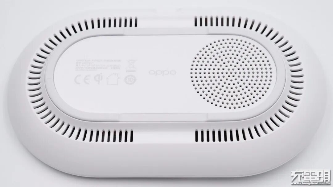 OPPO这款无线充电器采用卧式跑道造型设计,机身圆润扁平,设计简约。整个机身分为左侧风扇和右侧无线充两部分:左侧风扇部分和背面采用白色塑料外壳,表面哑光处理;无线充放置手机位置是深灰色橡胶,并贴有提示贴纸,印有手机正确放置标识。