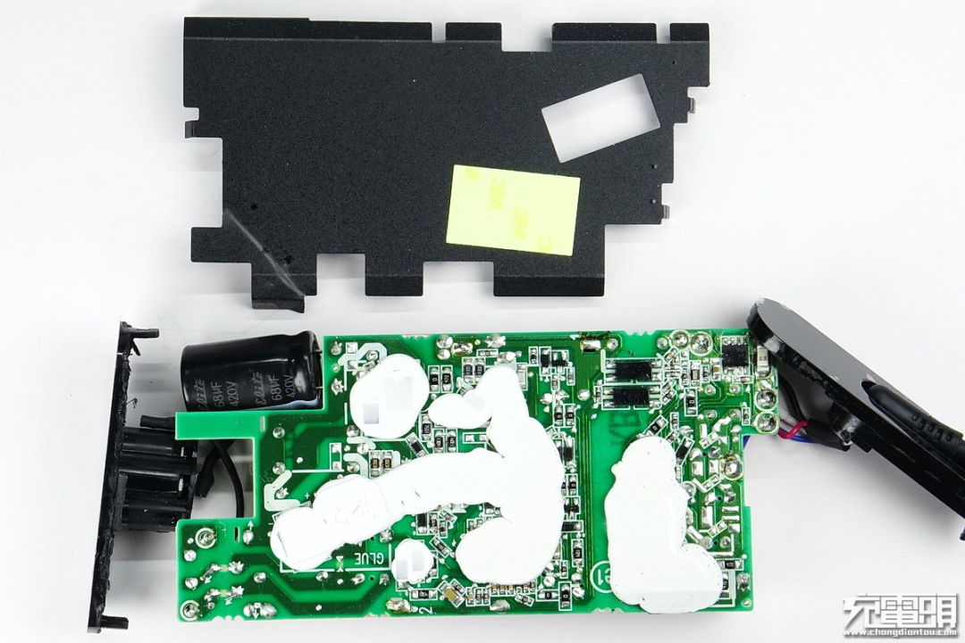 其次是设计方面,充电器从输入到输出布局合理层次分明,元器件焊接整齐紧凑。不仅配备了多块散热片,还通过注胶增强散热效果。此外变压器和电感电容等器件打胶加固,增强了稳定性。