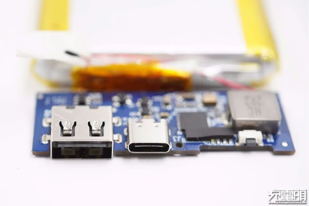 指示灯中有一颗白色指示灯,用于小电流输出状态指示,其余三颗为电量指示,旁边的电源键贴片焊接。