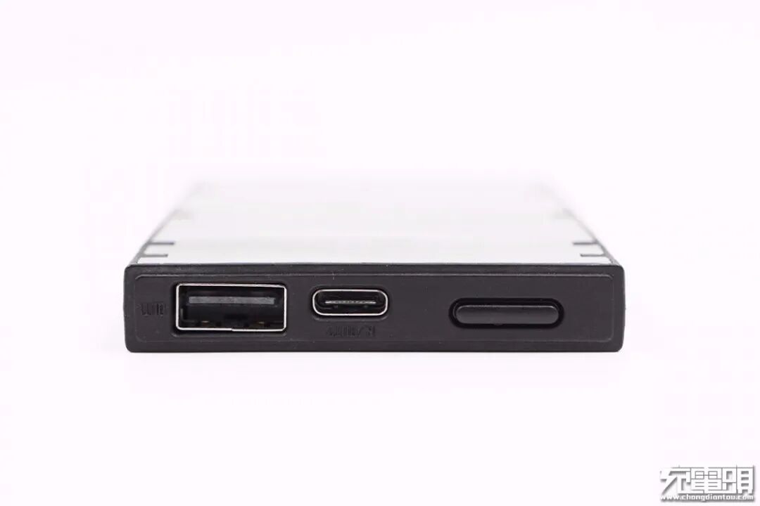 输出顶面设有USB-A输出接口、USB-C双向快充口和电源键。