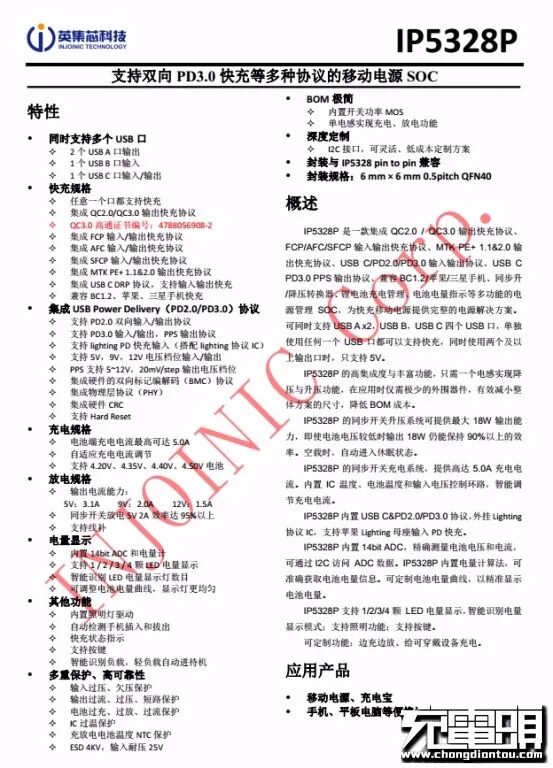英集芯IP5328规格资料。充电头网了解到,英集芯IP5328P还被腾讯赤兔马移动电源、品胜TS-D245 USB PD移动电源、羽博20000mAh PD移动电源、华美M10移动电源、OLODO CS3-PD18 移动电源、realme 10000mAh移动电源等数十款电源产品采用。