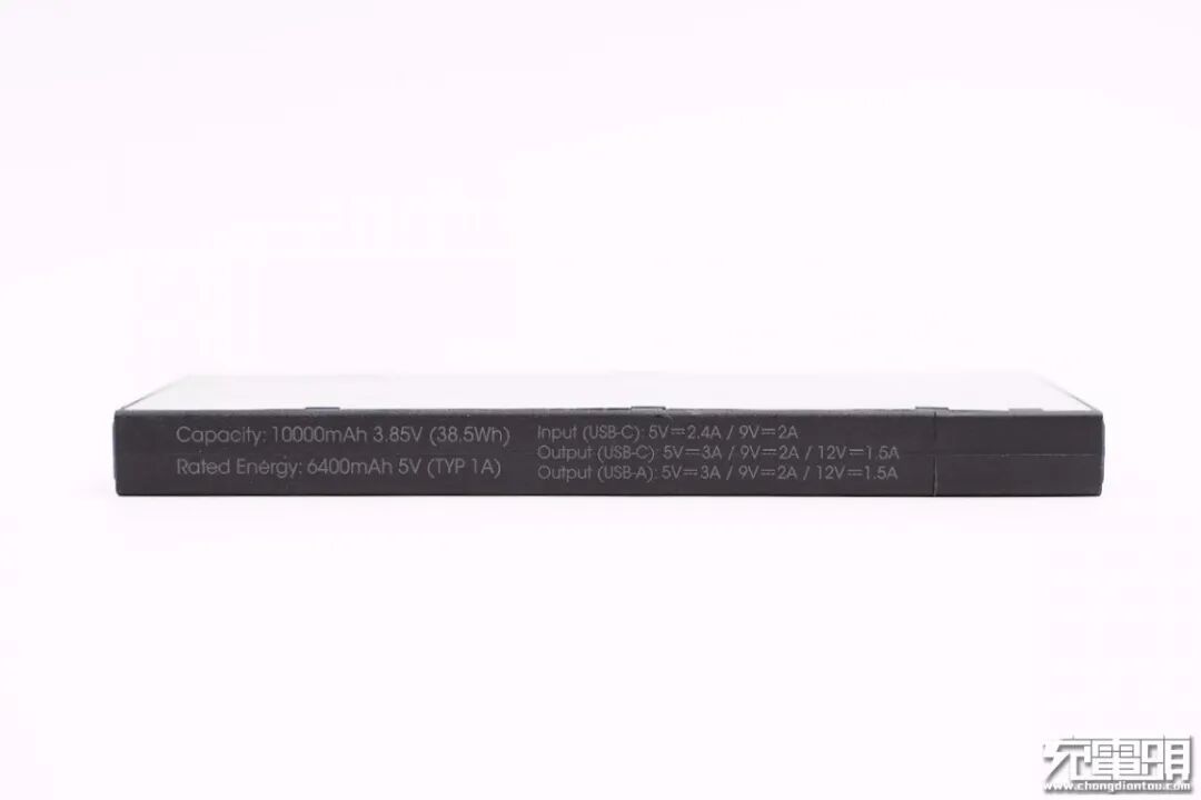 侧面标注产品的参数信息:电池容量:10000mAh/3.85V/38.5Wh,移动电源内部采用高平台电池;额定容量:6400mAh(TYP 5V1A);输入:5V2.4A或9V2A;USB-C/USB-A输出:5V3A、9V2A、12V1.5A。