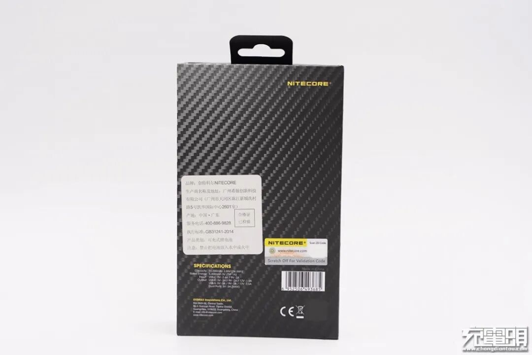 包装盒为黑色配色,表面有条纹设计,顶部带有挂钩,整体神秘感十足。包装盒正面印有NITECORE品牌、10000mAh容量等信息。