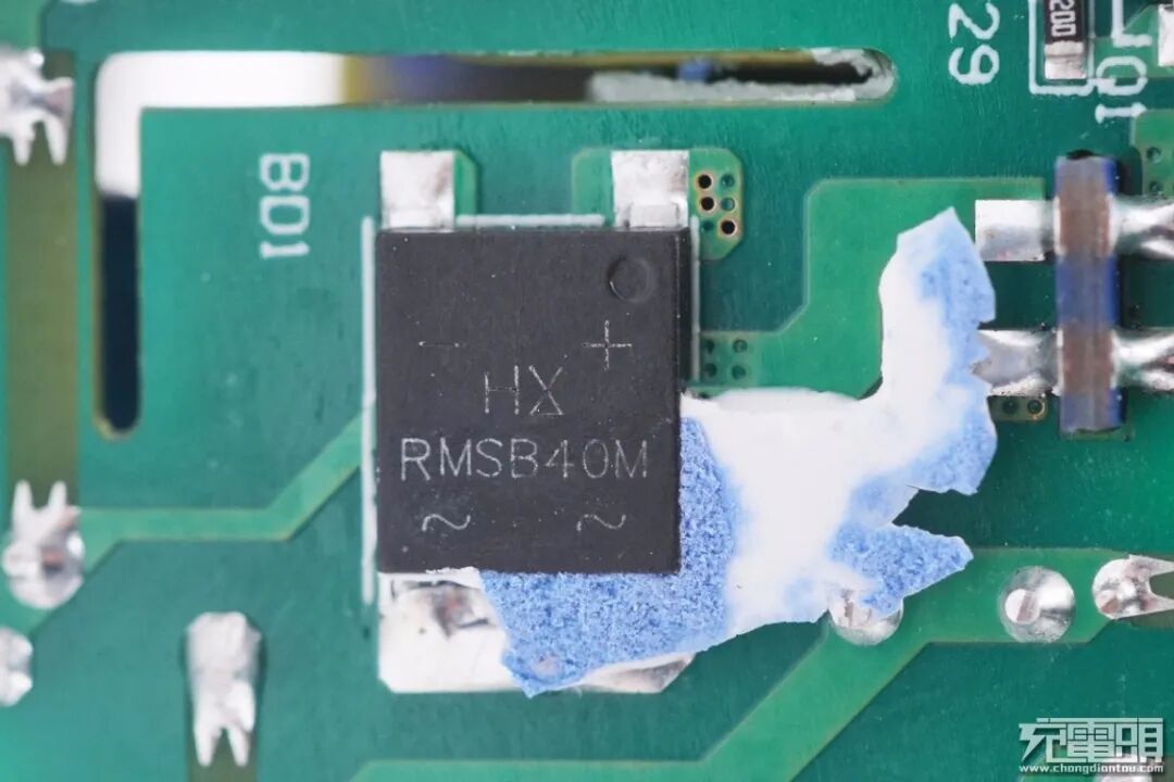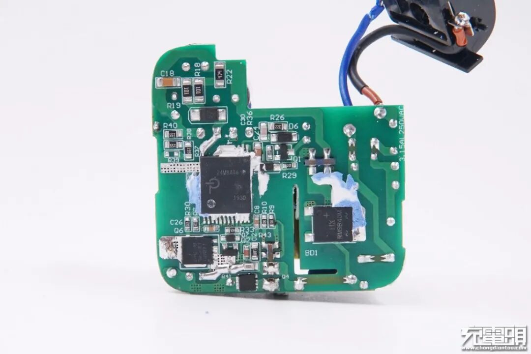 将导热垫以及硅胶去掉,板子背面上是整流桥、PI主控芯片、次级同步整流MOS以及输出VBUS开关。主控芯片横跨在初级次级之间,整流桥旁边镂空用来放置隔离板。