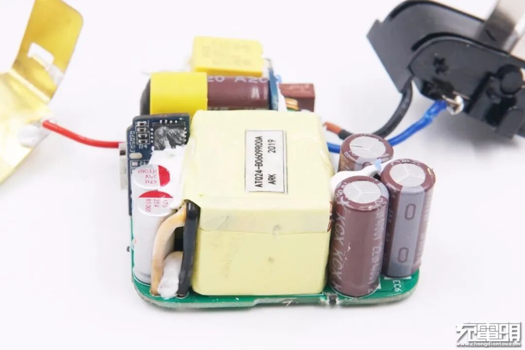 这款充电器内部结构紧凑,额外采用两块小PCB板设计,空间利用率高。此外小PCB板和变压器等元器件打胶加固,整流桥等主要发热芯片也打胶帮助导热,正背面均覆盖导热垫和黄铜散热片帮助导热,内部稳定性和散热性能有保证。
