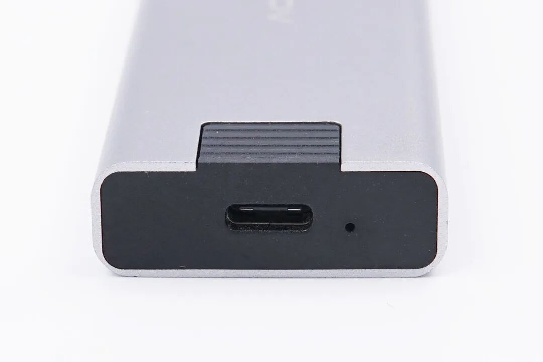 机身一端中心配有一个USB-C接口以及一颗LED指示灯,C口上端的塑料为凹凸条纹,方便将塑料框架抽出。