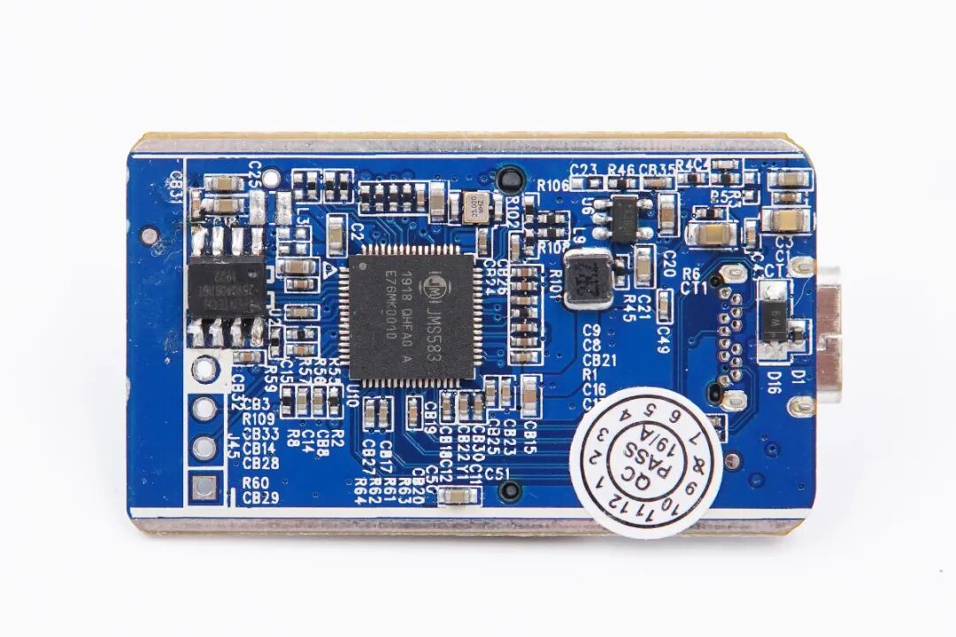 JMicron智微JMS583 USB3.1 Gen2到PCIe Gen3x2桥接控制器,用于连接主机和PCIe存储设备,接口提供10Gbps速率,是USB3.1 Gen1速率的二倍,支持对SSD进行TRIM操作,支持NVMe1.3。由旁边一颗25MHz无源晶振为其提供时钟。