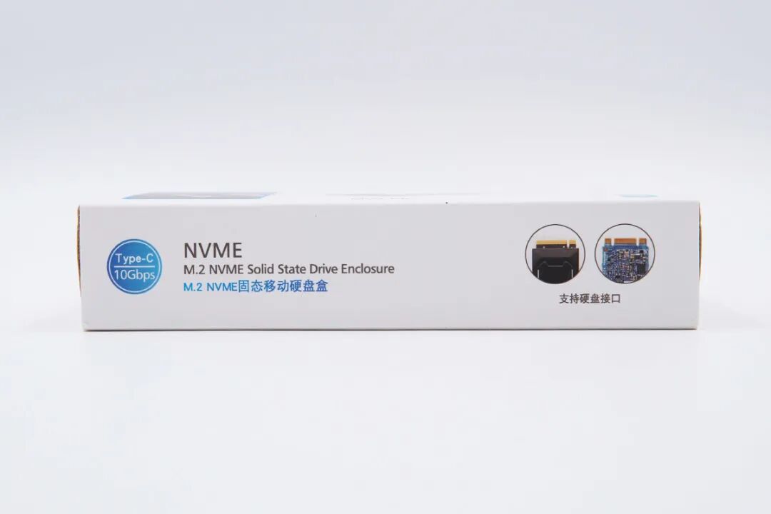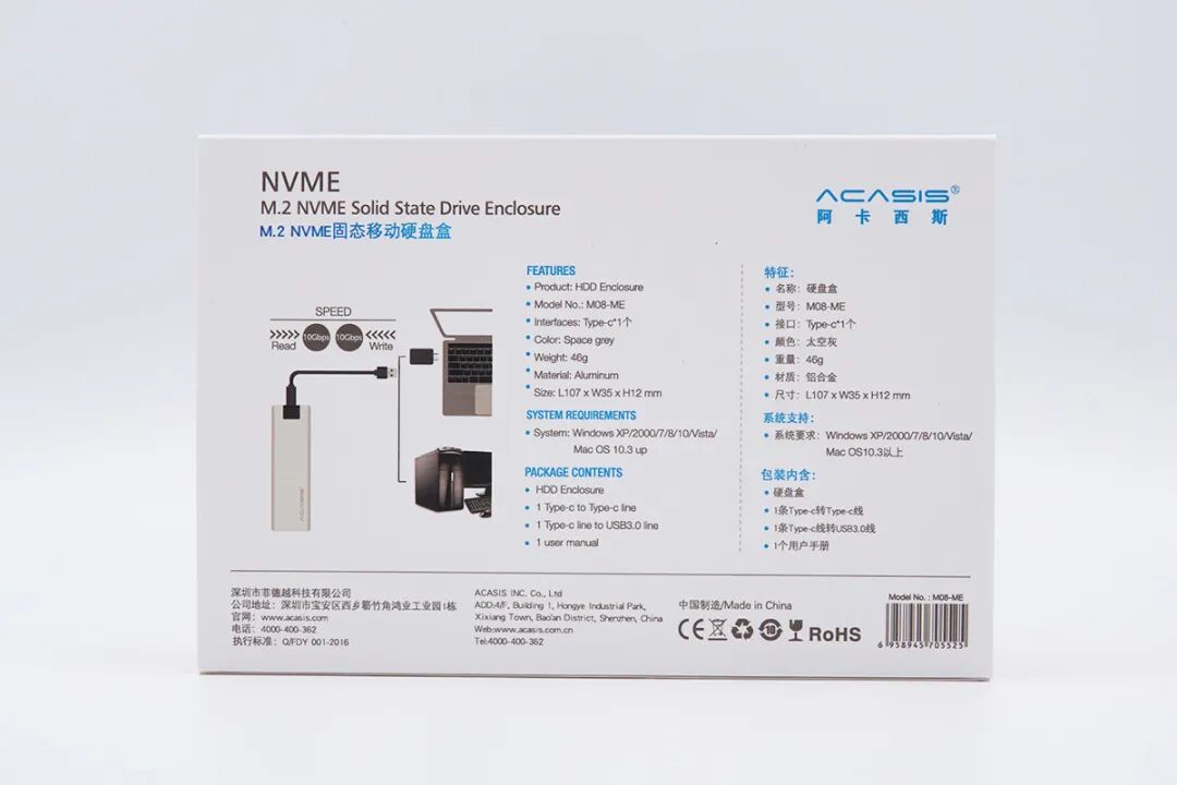 包装盒为抽拉式设计,外层纸壳的正面印有产品实物图以及使用图,上边是ACASIS阿卡西斯品牌和名称——M.2 NVME固态移动硬盘盒,下边是产品型号和三个特性图。
