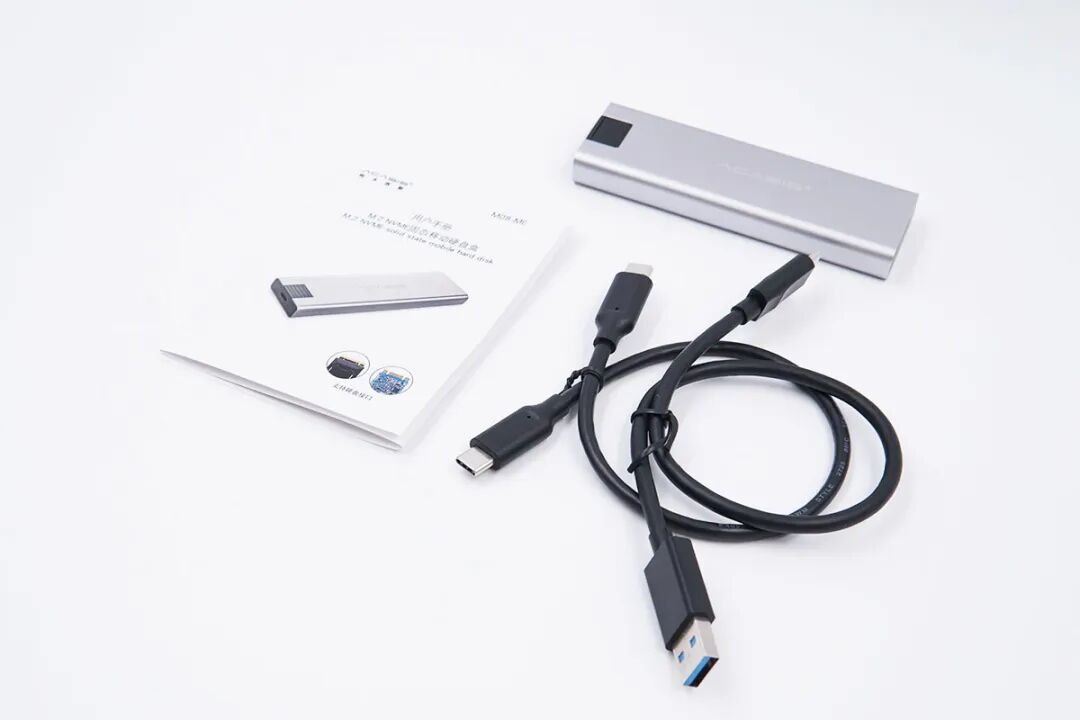 包装内含:M.2 NVME固态移动硬盘盒M08-ME、USB-C to USB-C数据线、USB-A to USB-C数据线和用户手册。