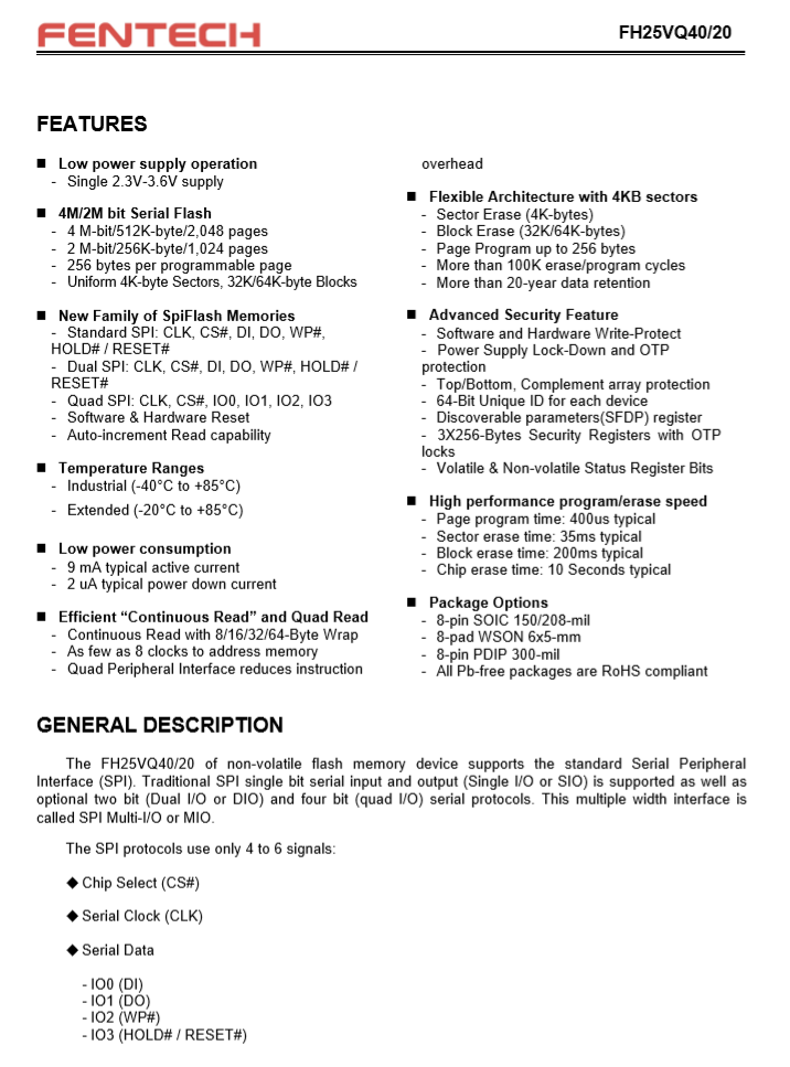 深圳锋华创芯微 FH25VQ40B,4Mbit 串行NOR FLASH存储器。