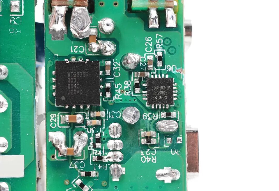 二次降压部分有三路独立输出,分别采用一颗南芯SC8002降压控制器,配合外置真茂佳MOS管实现降压输出,并由伟诠WT6636F作为协议识别。充电器内部布局紧凑,元器件之间采用了大量的注胶处理,高压侧的氮化镓功率器件和次级侧二次降压电路均有设有金属片帮助散热,整体用料讲究,做工十分扎实。