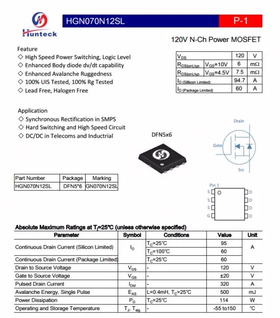 恒泰柯HGN070N12SL资料信息。充电头网了解到,采用这款MOS的产品还有电友65W 2C1A氮化镓快充充电器、ROCK 65W氮化镓快充充电器等。