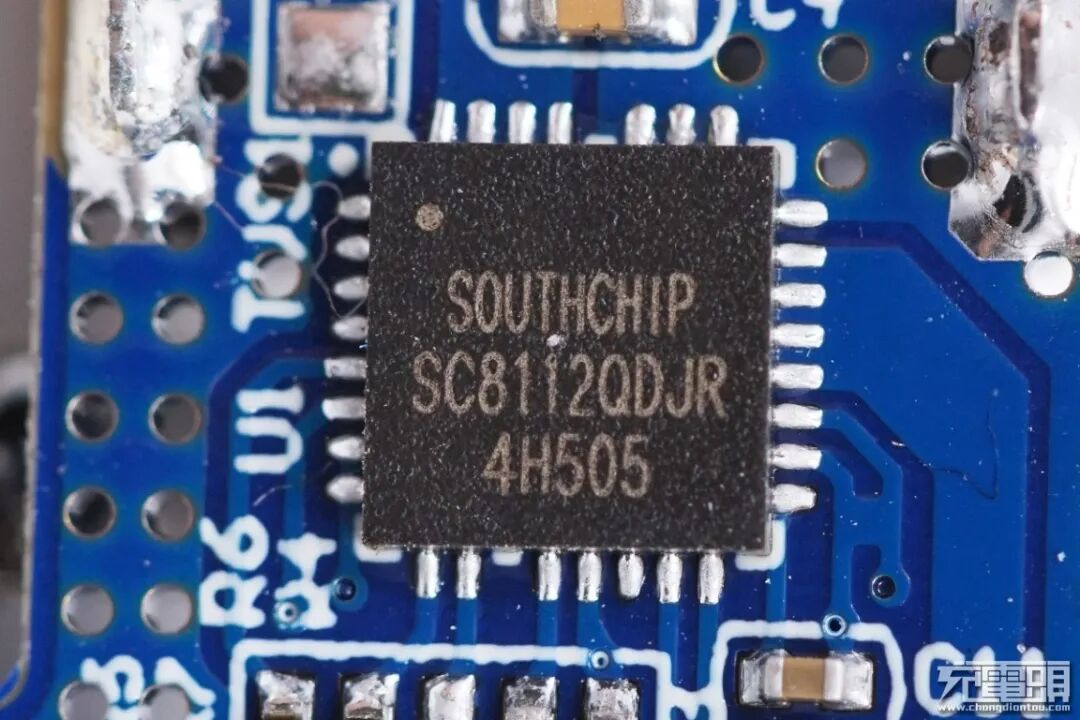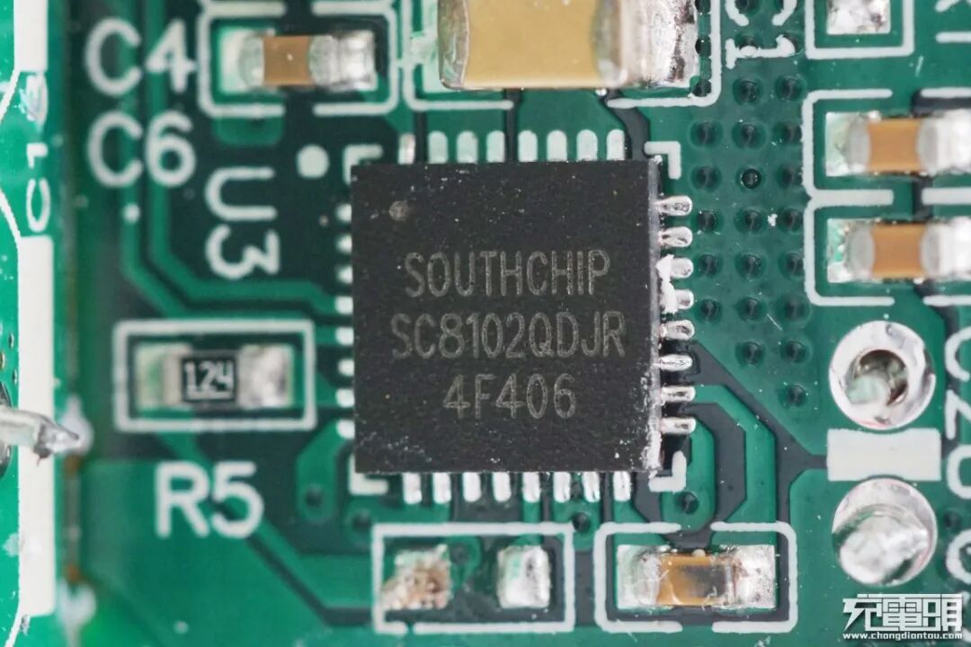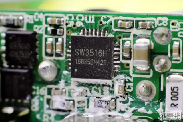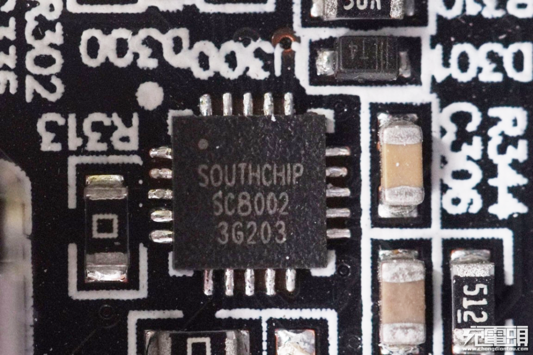 在两个接口之间是来自珠海智融的二次降压芯片,型号SW3518。这是一款高集成度的多快充协议双口充电芯片,支持A+C口任意口快充输出,支持双口独立限流。其集成了 5A 高效率同步降压变换器,支持PPS、PD、QC、AFC、FCP、SCP、PE、SFCP、VOOC等多种快充协议,CC/CV 模式,以及双口管理逻辑。外围只需少量的器件,即可组成完整的高性能多快充协议双口充电解决方案;旁边是两颗外挂的MOS管。