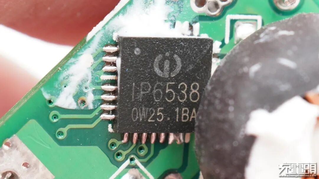 在两颗电容中间是来自英集芯的IP6515车充芯片,也是整个车充的心脏。据了解,英集芯IP6515是一款集成同步开关的降压转换器、支持DCP(BC1.2、Apple、三星)协议的双口输出SOC,可为车载充电器、适配器、智能排插、行车记录仪提供完整的解决方案。