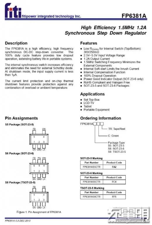 天钰 Fiti FP6381A 同步整流高效率降压IC,开关频率1.5MHz,最大输出电流1.2A。