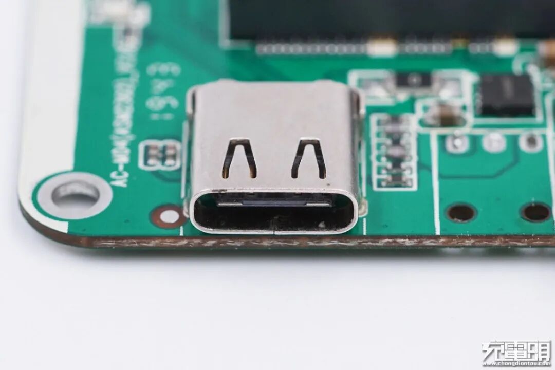 USB-C接口母座特写,黑色舌片不露铜,母座过孔焊接很牢固。