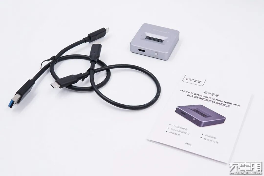 包装内含:M.2 NVME固态移动硬盘座M04、USB-C to USB-C数据线、USB-A to USB-C数据线和用户手册。