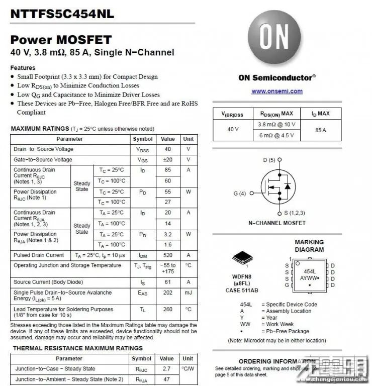 四颗安森美MOS管,型号为NTTFS5C454NL,耐压40V,适用于车载24V环境。