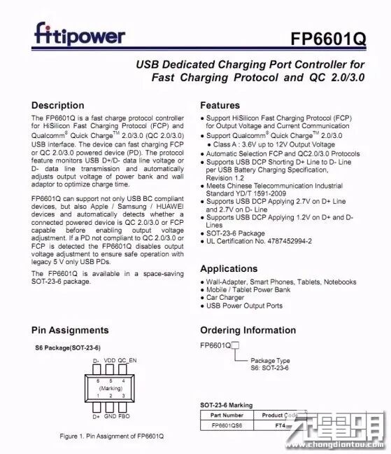 据充电头网了解,天钰FP6601Q快充协议芯片此前已被紫米18W QC3.0快充充电器、紫米65W USB PD三口快充充电器、DHL USB PD双口充电器等产品采用。此外,FP6601Q还可用于车充、移动电源领域,并被数十款电源配件采用。