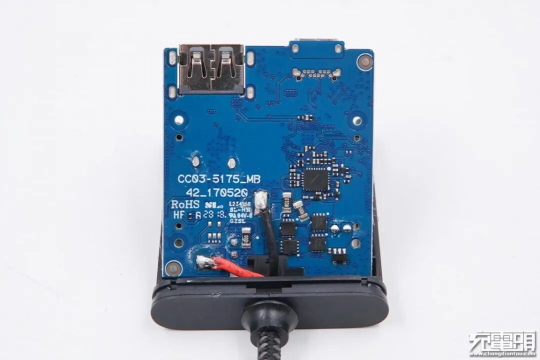 充电头网通过拆解了解到,产品USB-C输出电路采用了TI LM5175搭配安森美MOS管的同步升降压方案,此外还使用了天钰FP6601Q、现代单片机MC96F8216S和东芝MOS管;另一路采用了MPS MP2499降压芯片和天钰FP6601Q协议芯片,整体用料扎实。此外PCB板背面贴有导热垫,正面覆盖塑料保护壳,增强了产品耐用性和散热性能,并且内置过热检测功能,温度过高时及时关闭,确保安全。