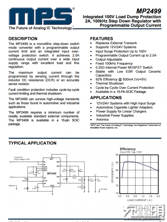 MPS芯源半导体的MP2499降压芯片,最大输出电流2A,用于USB-A口降压输出。