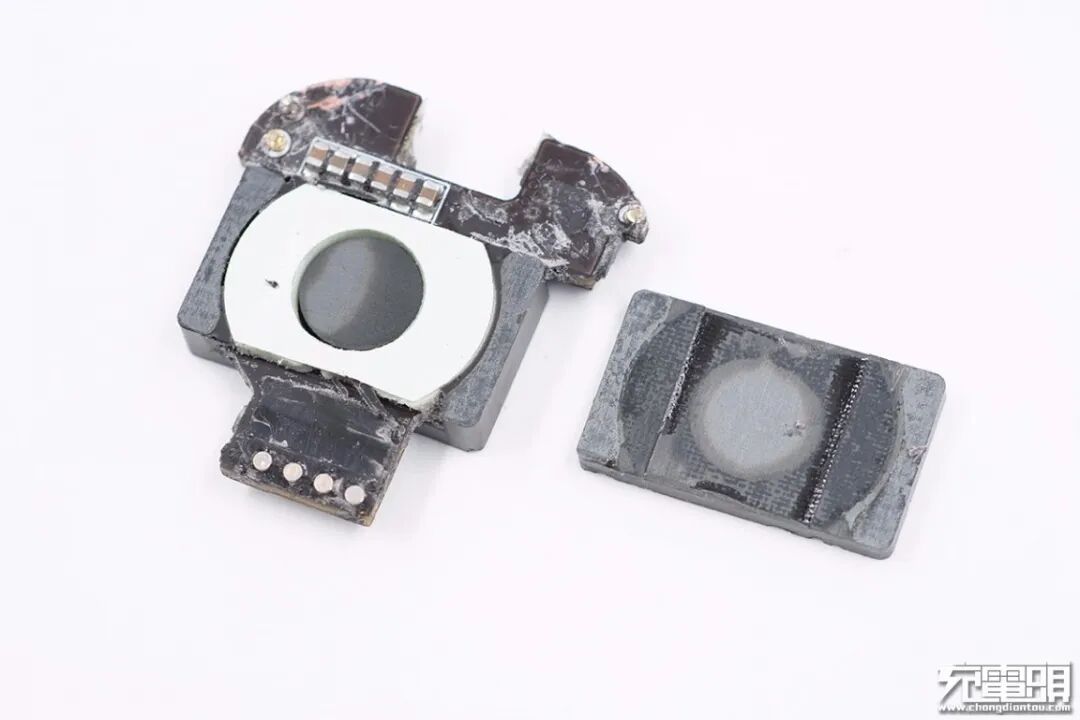 将磁芯拆开,内部有一块胶垫,中间圆形磁芯。
