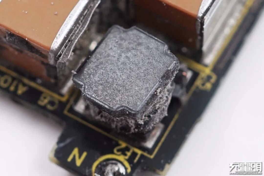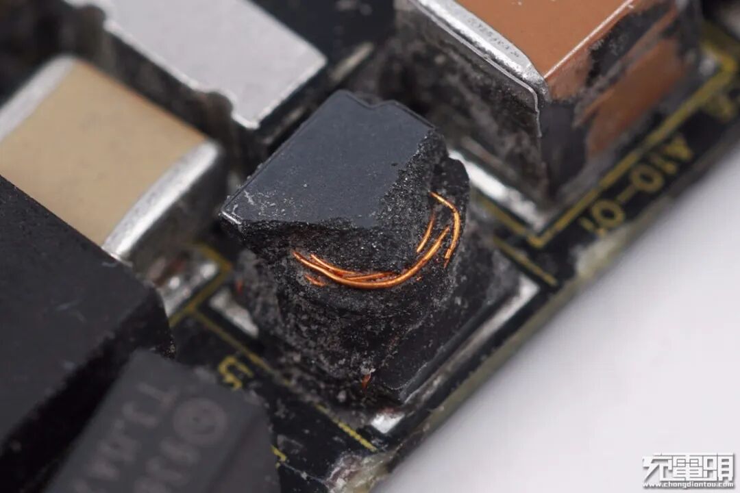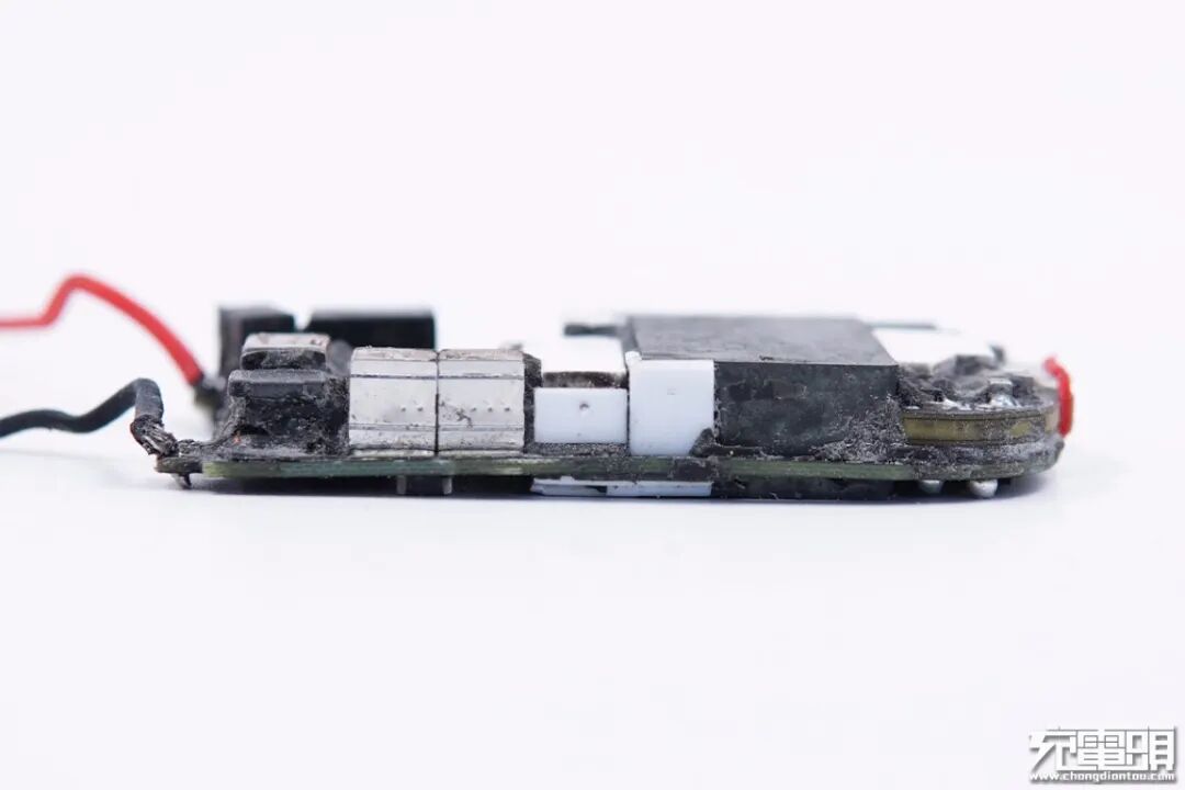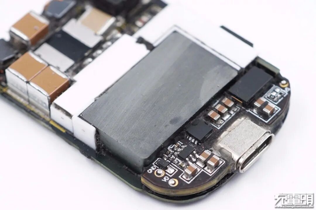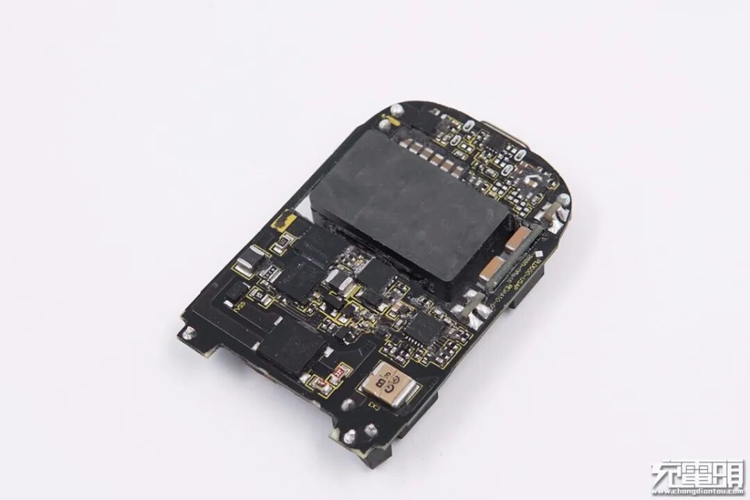 取出充电器电路板,电路板与外壳之间整体被导热黑胶填充。这样设计不仅增强充电器散热性能,并且增加内部元器件机械强度,简单说更加耐摔,耐候性更好。