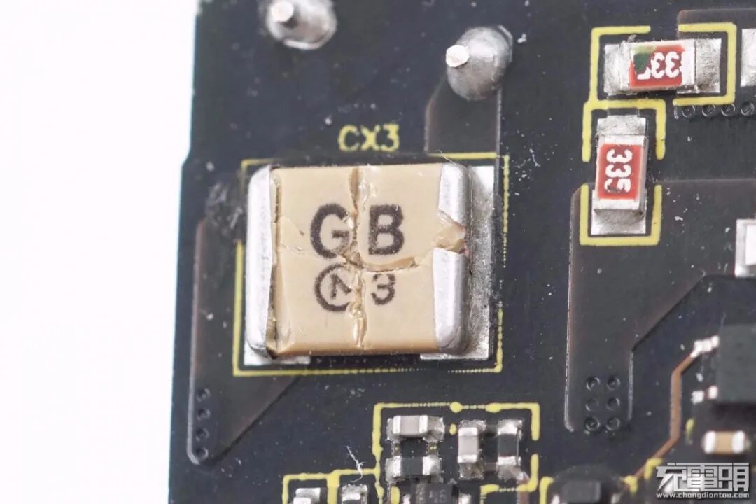 这一面可以看到初级采用的滤波电容是村田Murata KRM高压MLCC系列,金属端子将两个电容并联提高容量,采用村田这种金属端子的高压MLCC滤波电容,既可以抑制噪声,又可以提高机械强度减少失效。
