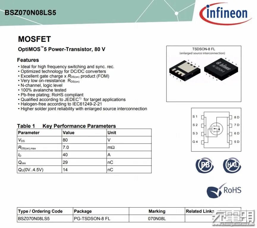 英飞凌 BSZ070N08LS 80V耐压NMOS,导阻7mΩ,用于次级同步整流。