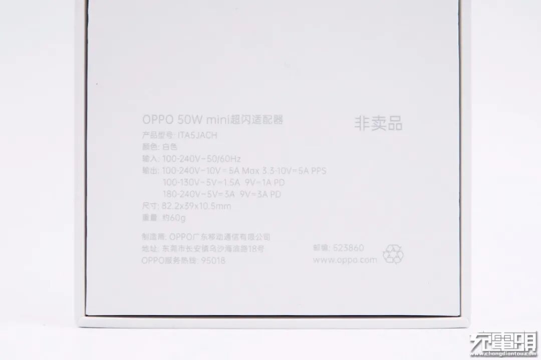 充电头网本次拿到的是媒体评测样机,参数信息显示,这款充电器最高输出电压为10V,最大输出功率为50W,并支持5A PPS快充。当输入电压在100-130V时,支持5V1.5A和9V1A输出档位;当输入电压在180-240V时,支持5V3A和9V3A输出;充电器厚度仅为10.5mm。