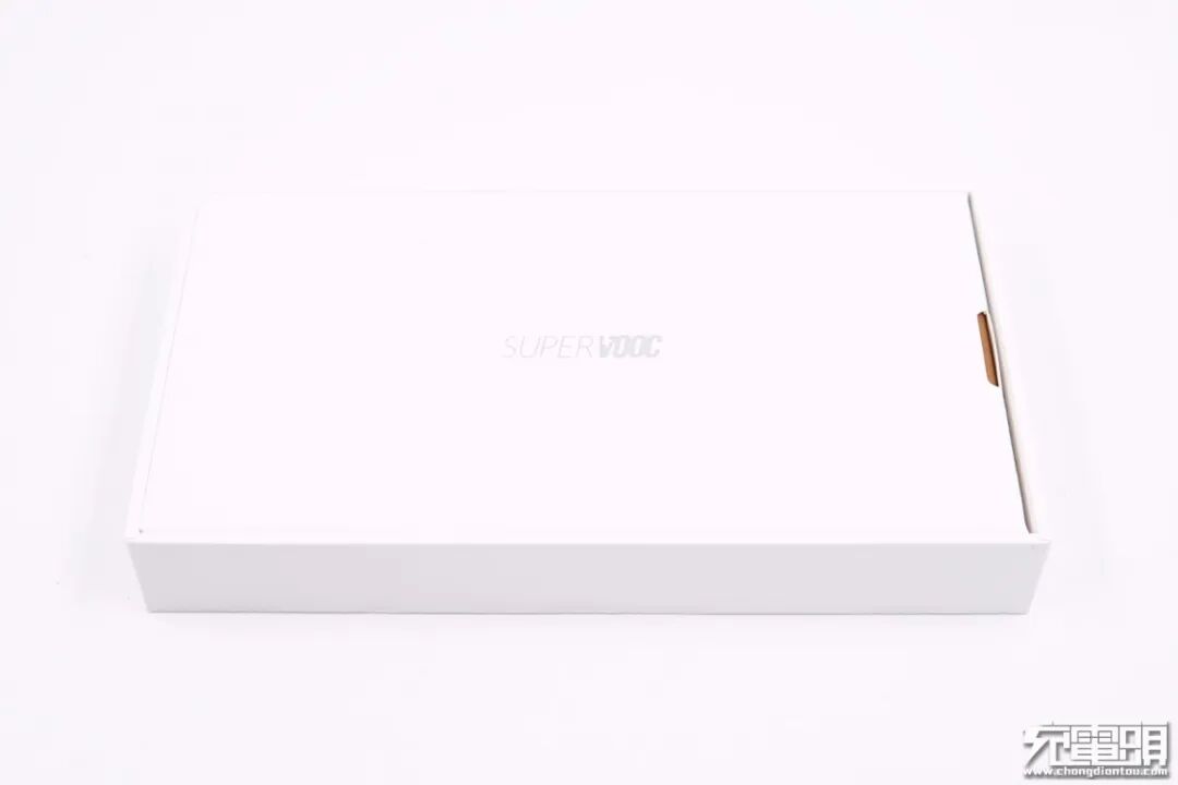 机身壳表面采用钢琴烤漆工艺处理,边角弧面过渡,顶面一端印有SUPERVOOC。整体洁白光滑,小巧精致,像极了一个艺术品。
