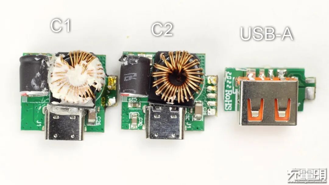 三块小板正面一览,两个USB-C母座所在小板上均设有降压电感和滤波电容。电容套有绝缘管,电感下面有绝缘板进行隔离,细节讲究。